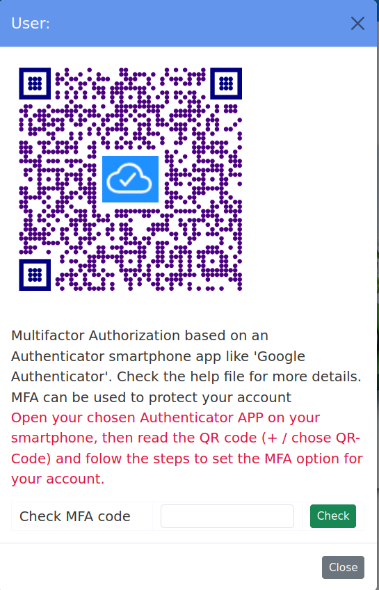 If you have lost your smartphone or the authenticator app or key record, you should ask your system administrator to reset MFA settings for you. It can be done in the user management module for your user account. The system administrator cannot change your MFA key but can delete it in order to recreate it when you log in with your user account.
